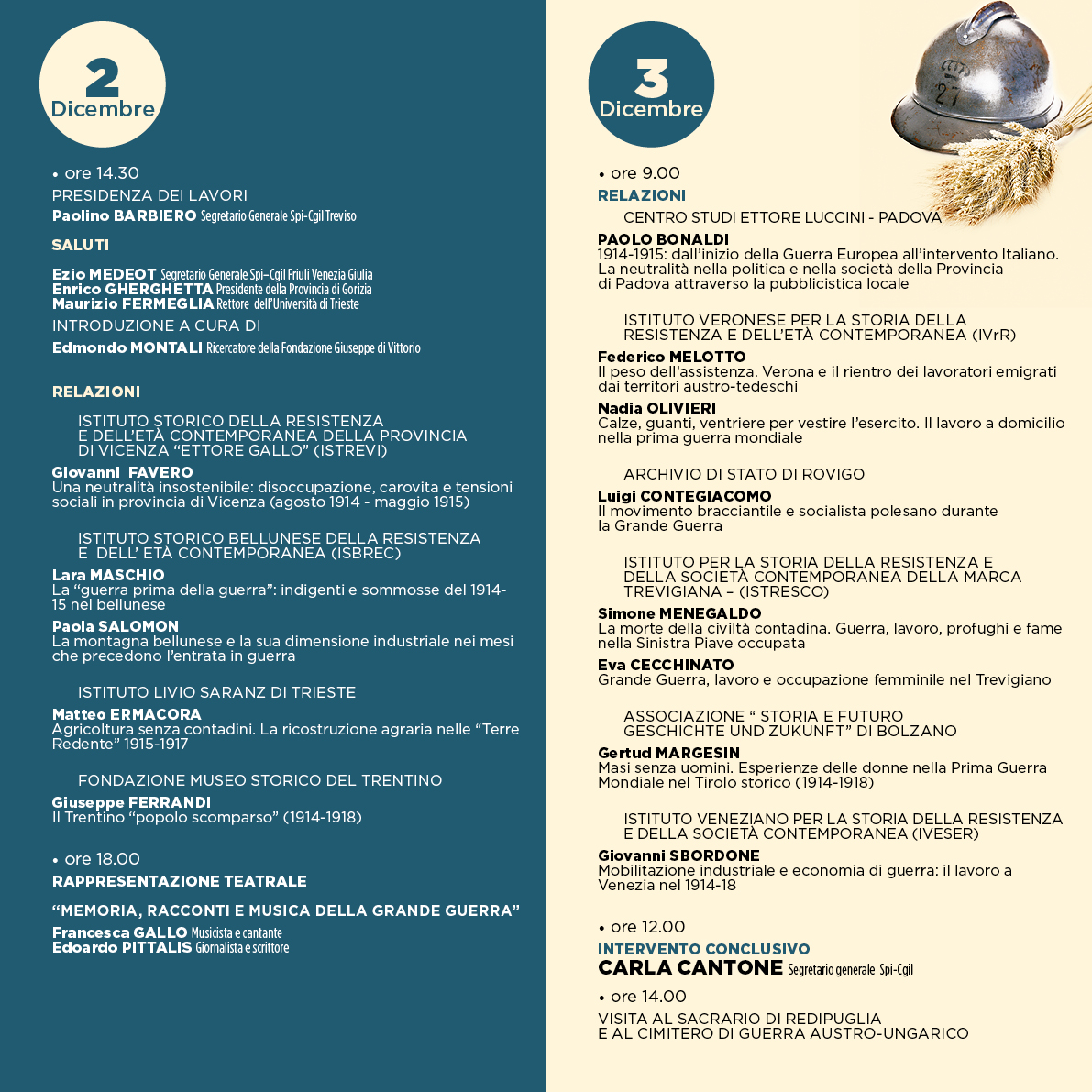 Si terrà al Conference Center di Gorizia, nei giorni 2-3 dicembre 2015 il convegno Guerra e pane. Operai e contadini nella Grande Guerra organizzato dallo Spi-Cgil Nazionale e dalla Fondazione Giuseppe Di Vittorio.