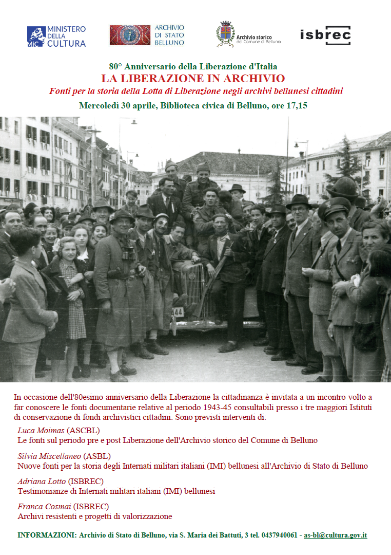 Nel pomeriggio, il Circolo Culturale 25 Aprile di Bolzano Bellunese, la Sezione Anpi “10 Marzo 1945” di Bolzano Bellunese, l’Isbrec e la Fondazione Società Bellunese organizzano un incontro alle ore 17.00 presso il salone dell’ex asilo di Bolzano Bellunese per festeggiare la giornata della Liberazione. Nel corso dell’incontro la lettura di alcuni brani tratti dai libri che trattano la Resistenza locale (Polenta e sassi di Emilio Sarzi Amadè, Recapito 67 di Augusto Righes, I patrioti della città del Piave di Giuseppe Fontana e Andata e ritorno di Renzo Guglielmino) e nazionale (I ventitre giorni della città di Alba di Beppe Fenoglio e passi Piero Calamandrei) sarà intercalata dalla proiezione di due interviste alle partigiane di Bolzano Bellunese Vivetta De Moliner e Agnese Righes, realizzate da Zenone Sovilla, e da canzoni della Resistenza italiana.