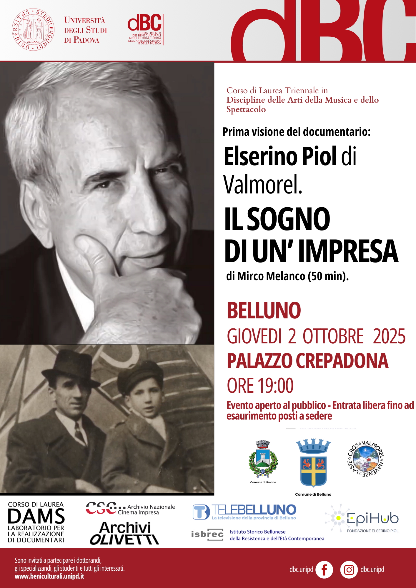 L’incontro di presentazione del progetto, che sarà moderato da Romina Zanon (Università di Udine, Isbrec), prevede innanzitutto la proiezione del trailer del documentario e, in seguito, gli interventi dei rappresentanti delle istituzioni che hanno promosso l’iniziativa ossia i Comuni di Belluno, Alpago e San Pietro di Feletto, il Dipartimento dei Beni Culturali dell’Università di Padova, l’Isbrec e Telebelluno. Interverrà poi Mirco Melanco (docente del Dipartimento dei Beni Culturali dell’Università di Padova e docente di Cinema del reale al Dams e di Storia della sceneggiatura alla Magistrale in Discipline dello Spettacolo e della Produzione Multimediale, nonché responsabile scientifico del Laboratorio per la realizzazione di documentari del Dams) che presenterà la prima puntata del documentario. Al termine della proiezione interverranno Giulio Sonego, figlio di Rodolfo, nuovamente Mirco Melanco e gli studenti che hanno lavorato al progetto.