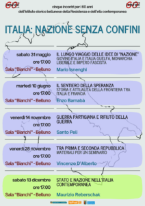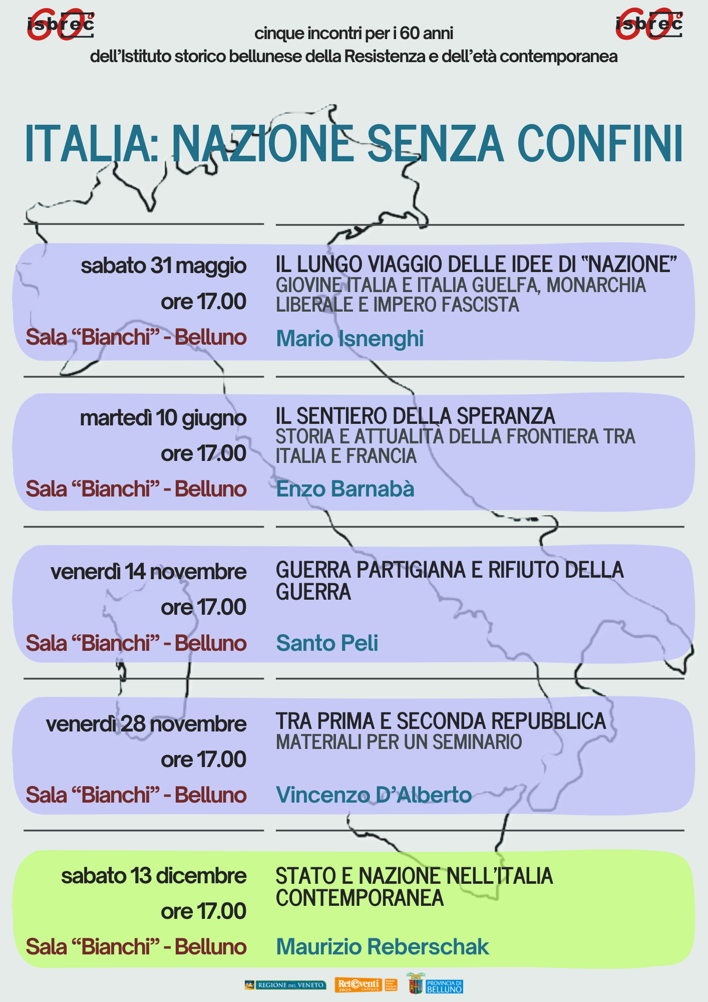 Si conclude il ciclo di incontri organizzato per i 60 anni dell’Isbrec e dedicato al tema “Italia: nazione senza confini”. Il quinto e ultimo appuntamento appuntamento si svolgerà sabato 13 dicembre alle ore 17.00 in sala “Bianchi” a Belluno e vedrà la partecipazione dello storico Maurizio Reberschak, componente del Consiglio direttivo dell’Isbrec. Il titolo del suo intervento è “Stato e Nazione nell’Italia contemporanea“.