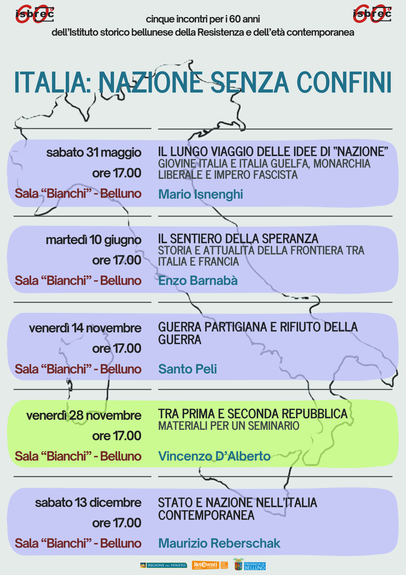 e dedicato al tema “Italia: nazione senza confini”. Il quarto appuntamento si svolgerà venerdì 28 novembre alle ore 17.00 in sala “Bianchi” a Belluno e vedrà la partecipazione di Vincenzo D’Alberto, già docente nei licei bellunesi e componente del Comitato scientifico dell’Isbrec; il titolo del suo intervento è “Tra prima e seconda repubblica. Materiali per un seminario“.