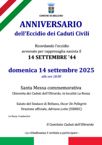 di Belluno organizzano la commemorazione dei civili caduti per rappresaglia nazista il 14 settembre 1944 alle porte della città. L’appuntamento è domenica 14 settembre alle ore 18.00 presso la Chiesetta dei Caduti dell’Oltrardo in località La Rossa (Belluno).