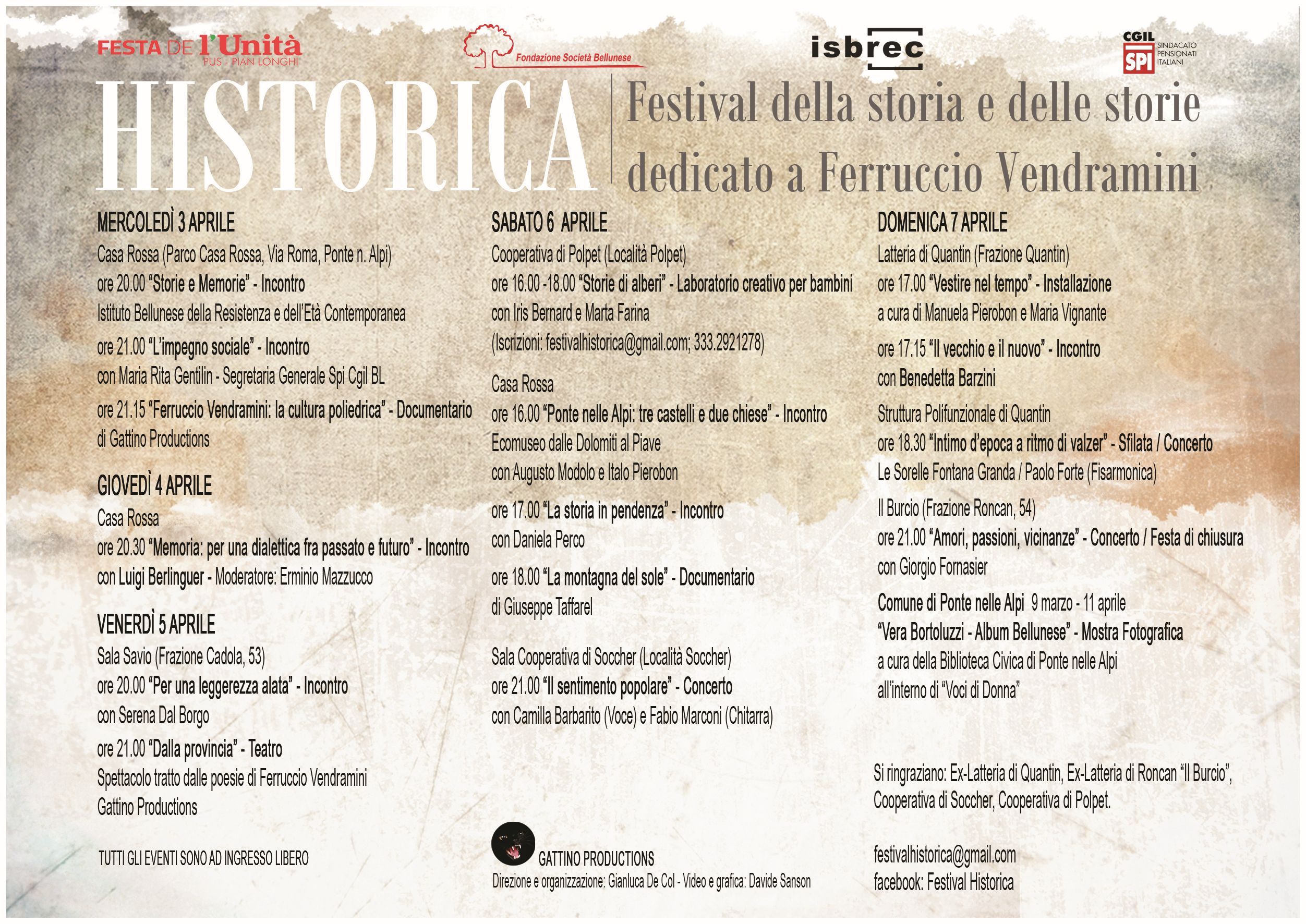 Da mercoledì 3 a domenica 7 aprile si svolgerà a Ponte nelle Alpi la rassegna Historica – Festival della storia e delle storie dedicato a Ferruccio Vendramini organizzata da Isbrec, Festa dell’Unità/Pus-Pian Longhi, Fondazione Società Bellunese e Spi-Cgil di Belluno per volontà e con il supporto della famiglia Vendramini.