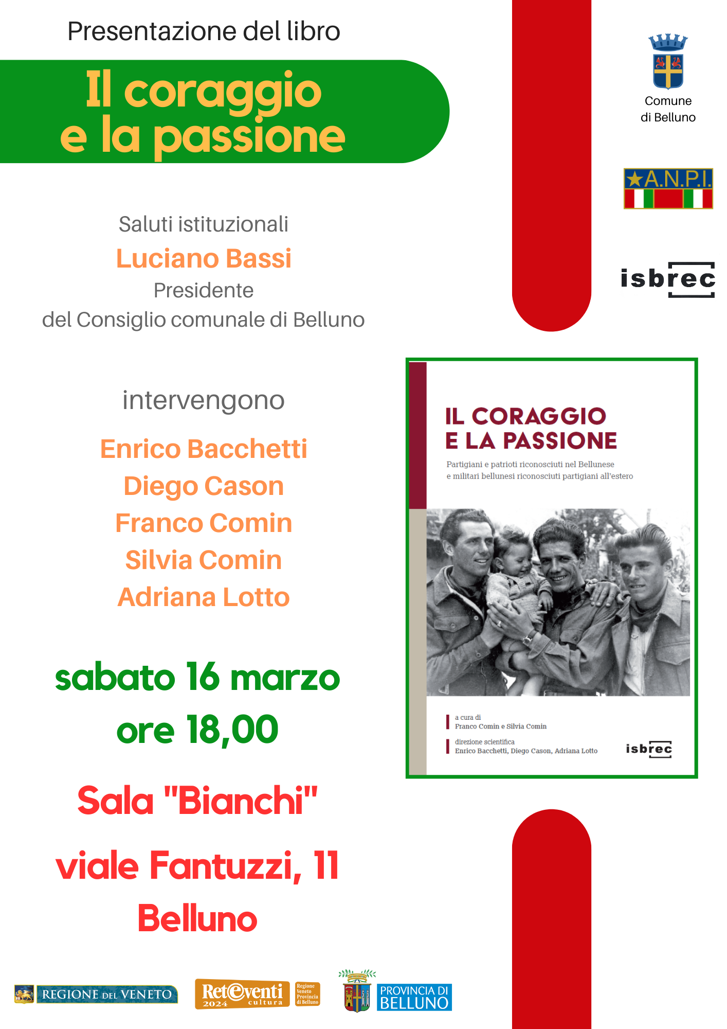 partigiani impiccati al Bosco delle Castagne (10 marzo 1945) e dei quattro partigiani impiccati a Belluno in piazza dei Martiri (17 marzo 1945), Isbrec, Comune di Belluno e Anpi Belluno organizzano la presentazione del libro Il coraggio e la passione. Partigiani e patrioti riconosciuti nel Bellunese e militari bellunesi riconosciuti partigiani all’estero curato da Franco Comin e Silvia Comin con la direzione scientifica di Enrico Bacchetti, Diego Cason e Adriana Lotto (Isbrec 2023).