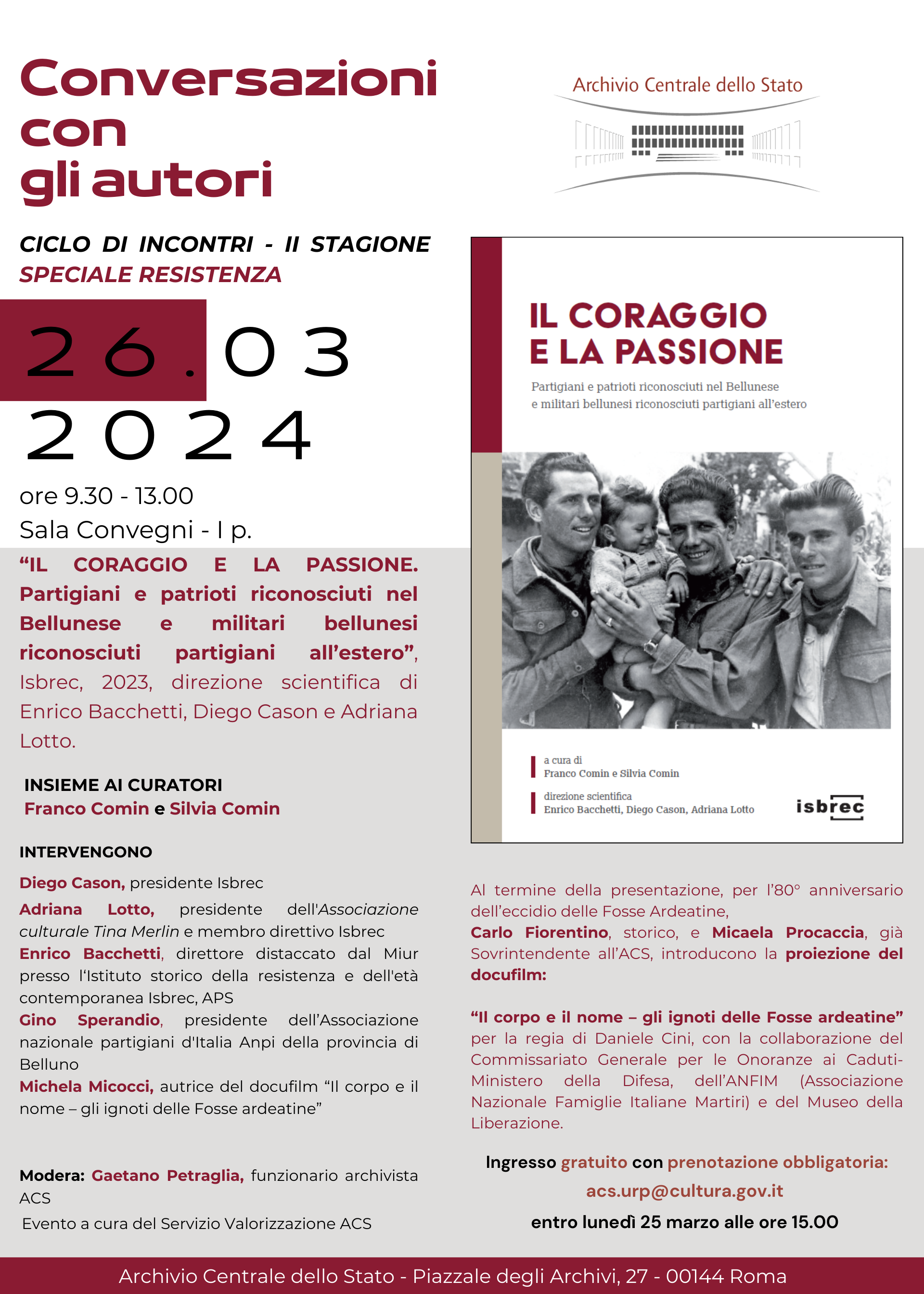 incontro del format “Conversazioni con gli autori” II stagione, l’Archivio centrale dello Stato organizza la presentazione del libro Il coraggio e la passione. Partigiani e patrioti riconosciuti nel Bellunese e militari bellunesi riconosciuti partigiani all’estero (Isbrec, 2023) a cura di Franco Comin e Silvia Comin con la direzione scientifica di Enrico Bacchetti, Diego Cason, Adriana Lotto.