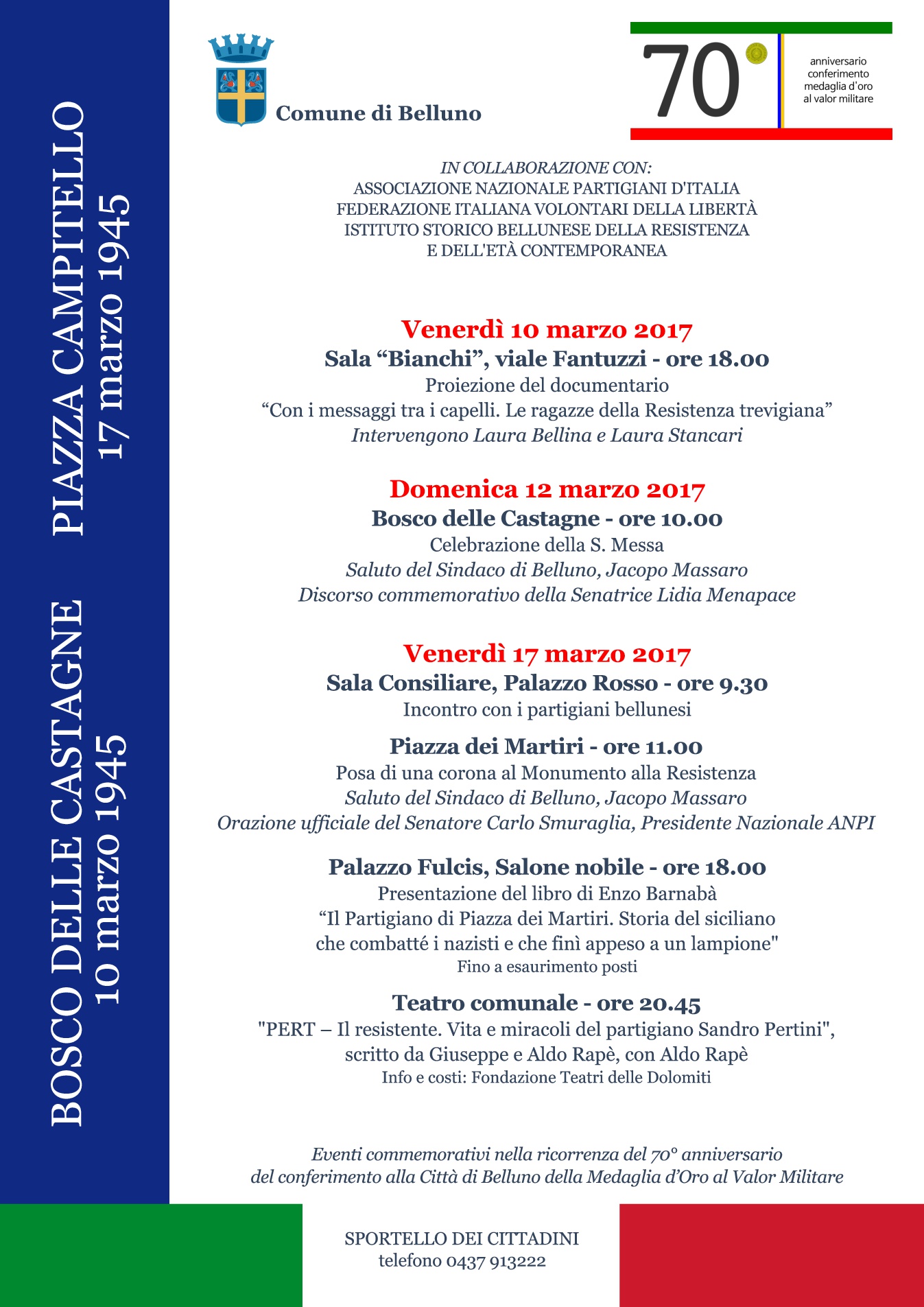 Nel quadro delle celebrazioni per il 70° anniversario del conferimento della Medaglia d’Oro alla città di Belluno per la lotta di Liberazione della provincia e nel giorno della commemorazione dei quattro partigiani impiccati in Piazza dei Martiri a Belluno, venerdì 17 marzo 2017 alle ore 18.00 presso il Salone nobile di Palazzo Fulcis a Belluno verrà presentato il libro di Enzo Barnabà Il partigiano di Piazza dei Martiri. Storia del siciliano che combatté i nazisti e finì impiccato a un lampione.