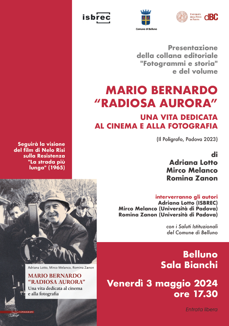 la sala “Bianchi”, ci sarà la presentazione del libro di Adriana Lotto, Mirco Melanco, Romina Zanon Mario Bernardo “Radiosa Aurora”. Una vita dedicata al cinema e alla fotografia (Il Poligrafo, 2023), seguita dalla proiezione del film La strada più lunga, di Nelo Risi (1965). Dopo i saluti istituzionali, interverranno gli autori del volume.