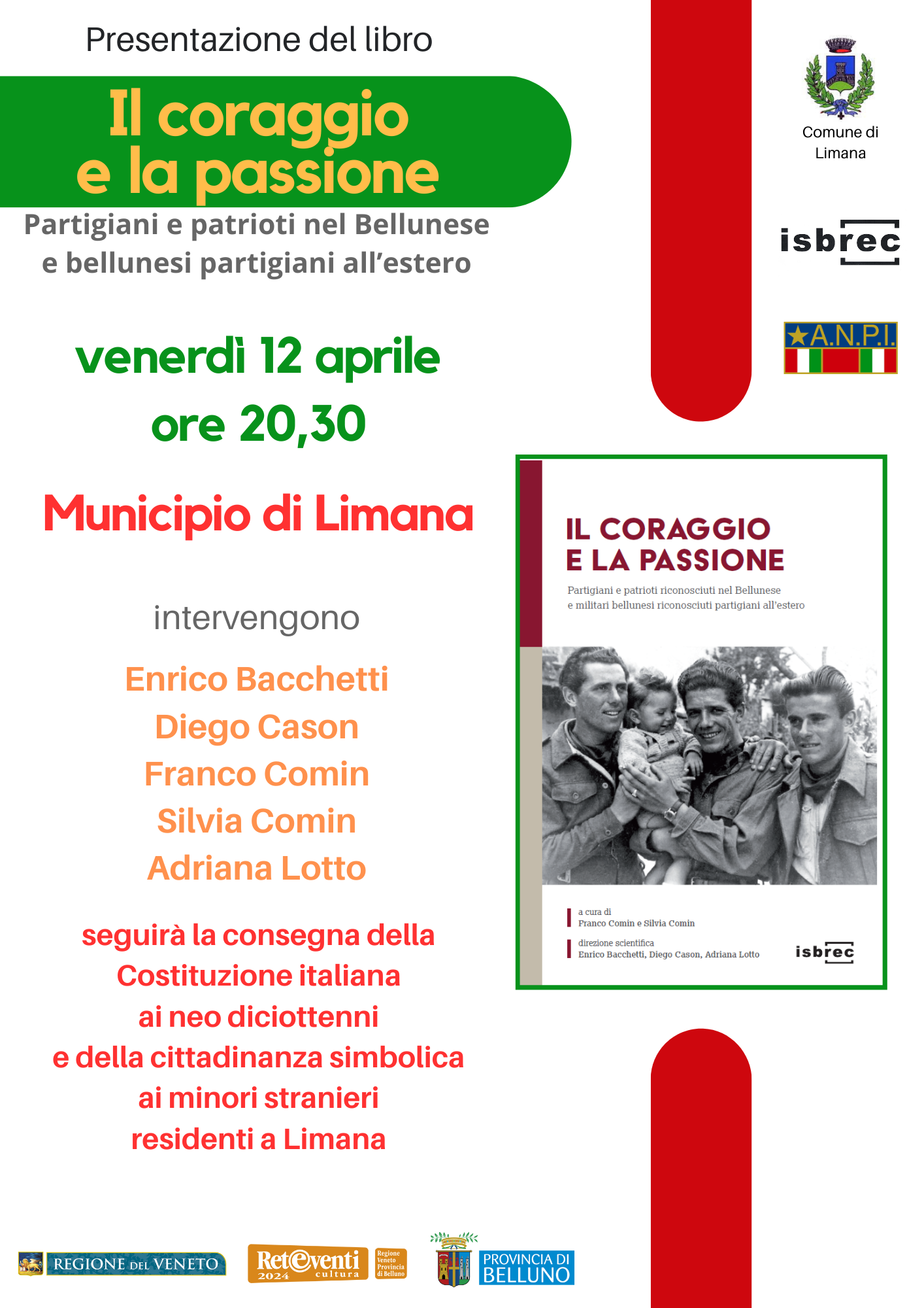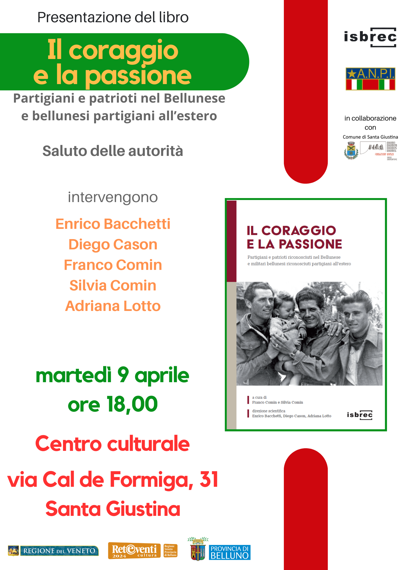 Continua la serie di incontri di presentazione del libro Il coraggio e la passione. Partigiani e patrioti riconosciuti nel Bellunese e militari bellunesi riconosciuti partigiani all’estero (Isbrec, 2023) a cura di Franco Comin e Silvia Comin con la direzione scientifica di Enrico Bacchetti, Diego Cason, Adriana Lotto.
