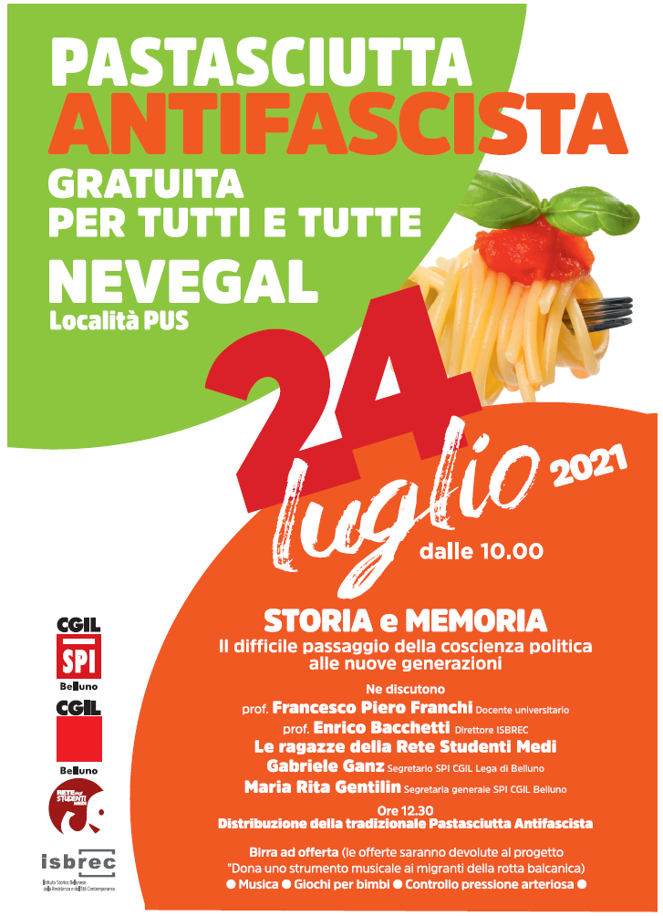 Isbrec e Rete degli Studenti Medi, invita tutti all’iniziativa Pastasciutta Antifascista che si svolgerà sabato 24 luglio 2021 in località Pus in Nevegal a partire dalle ore 10.00.