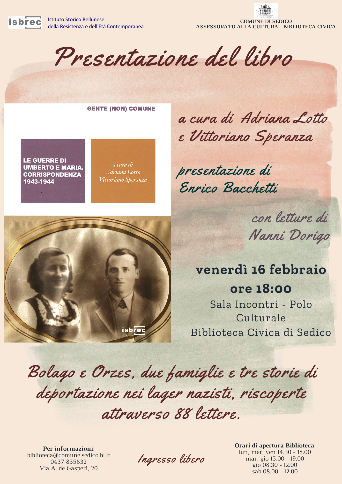 Isbrec e Biblioteca civica di Sedico organizzano la presentazione del libro Le guerre di Umberto e Maria curato da Adriana Lotto e Vittoriano Speranza (Isbrec, 2023). L’incontro si terrà venerdì 16 febbraio alle ore 18.00 a Sedico, presso la Sala Incontri – Polo Culturale della Biblioteca Civica di Sedico in via De Gasperi 20.